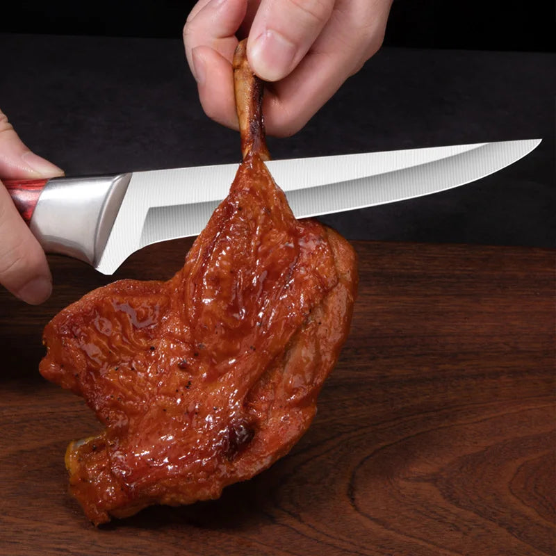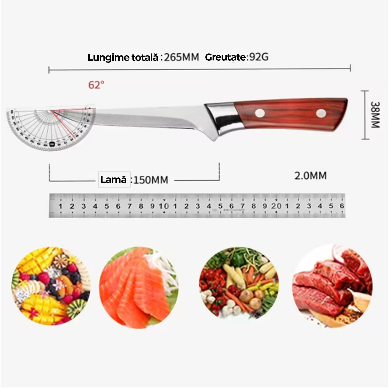 ✔ Versatil și practic – ideal pentru dezosare, tranșare carne (porc, vită, oaie, pește) și pentru felierea rapidă a fructelor și legumelor.
