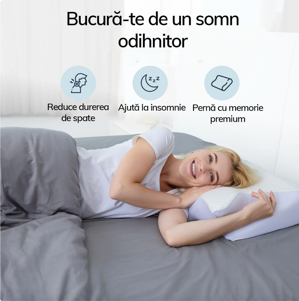Realizată din spumă cu memorie de înaltă densitate, perna noastră se adaptează la curbura naturală a corpului tău, oferind suport personalizat. Spre deosebire de pernele tradiționale, spuma noastră cu memorie își păstrează forma și fermitatea, asigurând confort constant pe tot parcursul nopții.